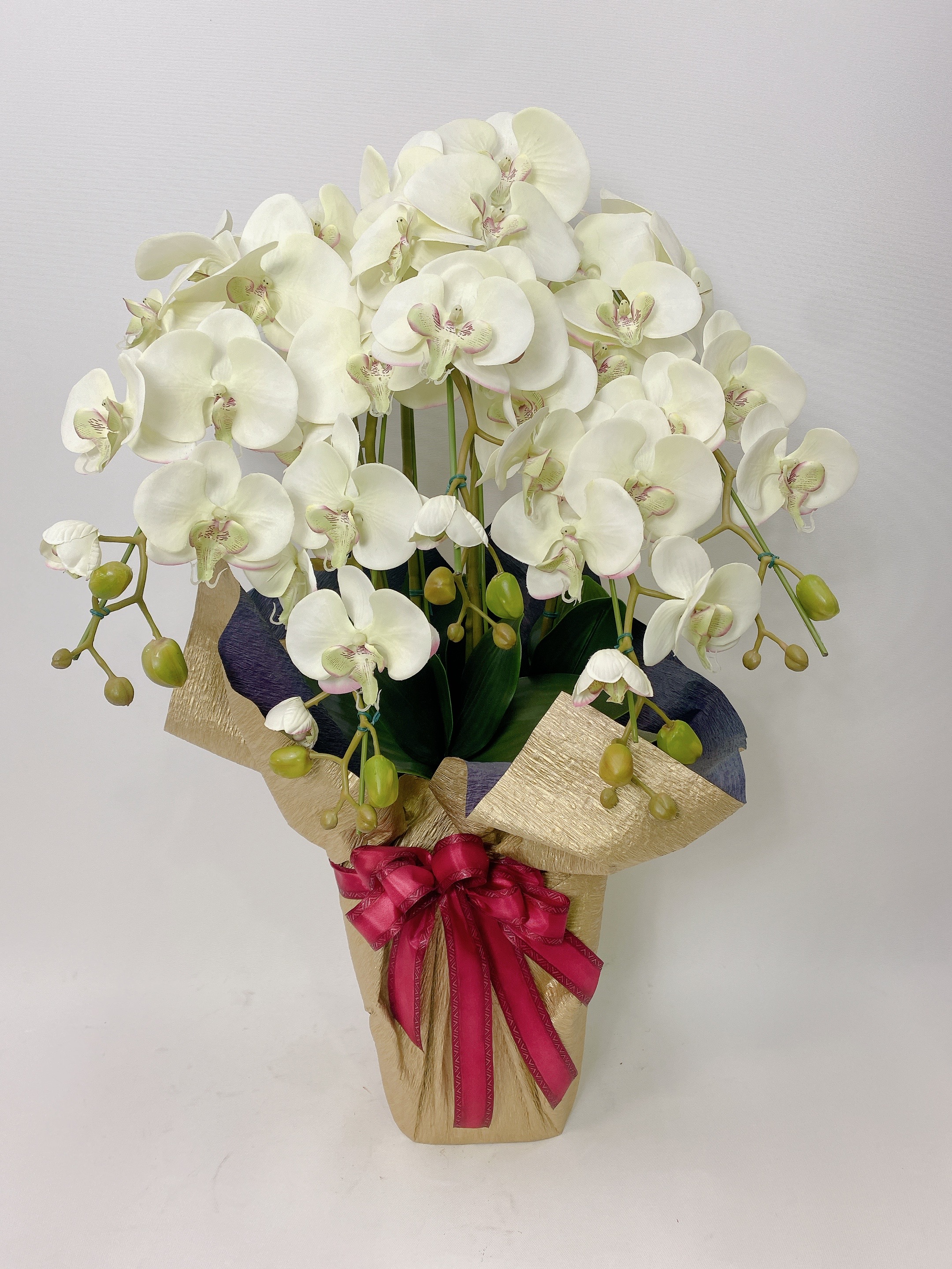 商品説明: サイズ(cm) 横幅:50 奥行き:40 高さ:80 ※計測位置による若干の誤差はご了承下さいませ。 使用花材: 造花胡蝶蘭/プラスチック鉢
